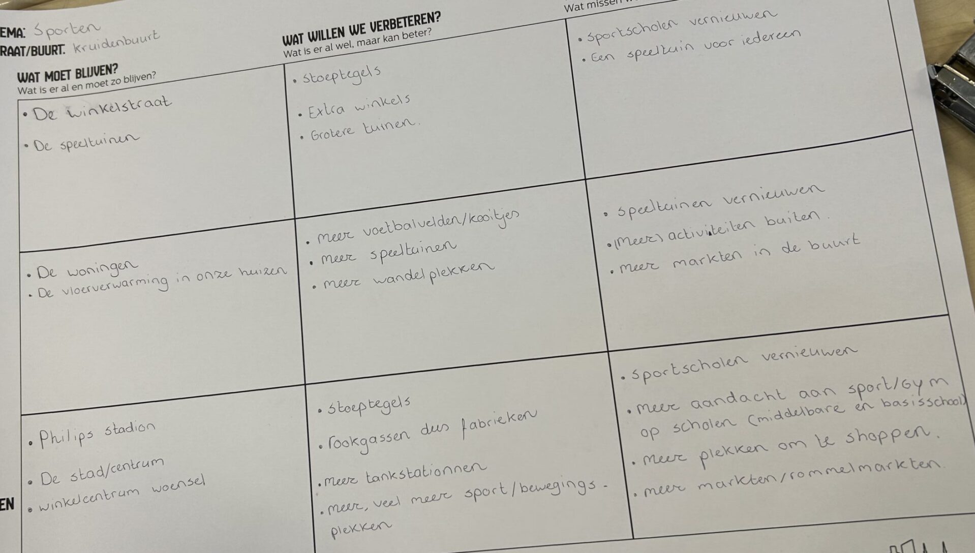 In onze wijk: meer voetbalvelden/kooien, meer speeltuinen, meer wandelplekken.