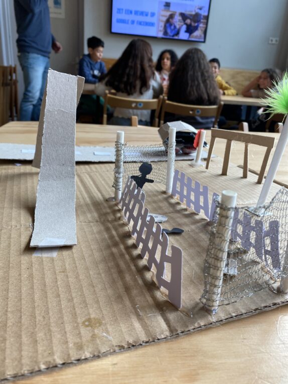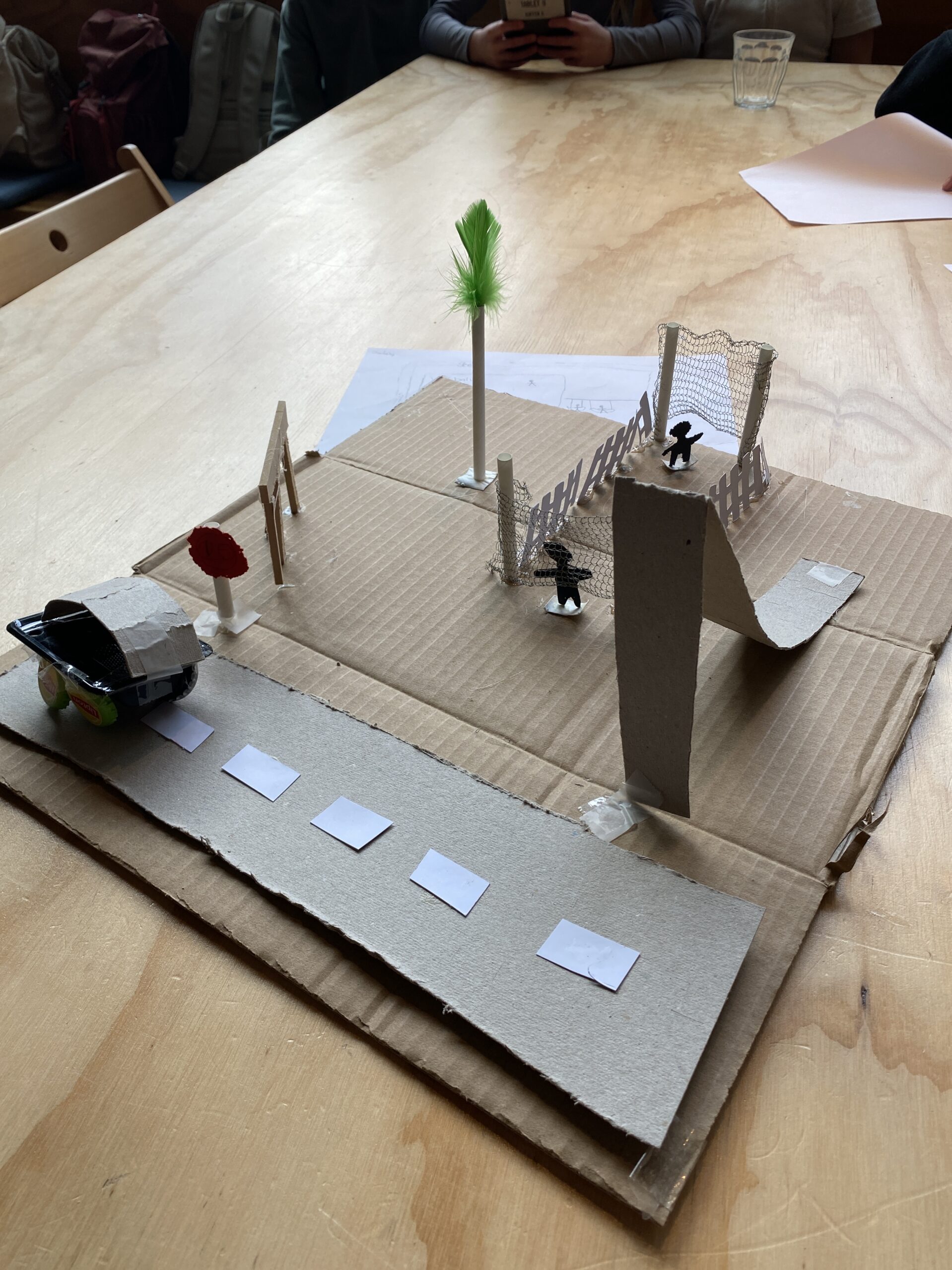 Een grote glijbaan,voetbalveld,een weg met een auto